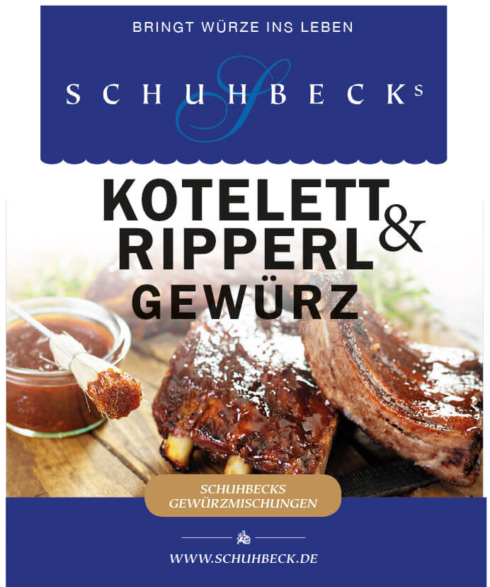 Pro Portion 1/2 bis 1 TL Schuhbecks Kotelett & Ripperl Gewürz gleichmäßig auf das Fleisch streuen und anschließend braten oder grillen.